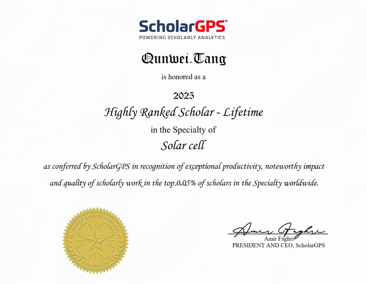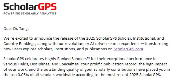 国际学术机构ScholarGPS发布了2025年度全球前0.05%顶尖科学家(Highly Ranked Scholar)榜单,我院唐群委教授凭借在太阳能电池领域的卓越贡献,入选“终身榜单”(Highly Ranked Scholar - Lifetime)全球第69位。该榜单收录依据发表、影响和质量综合评估,进入全球前0.05%的顶尖学者。