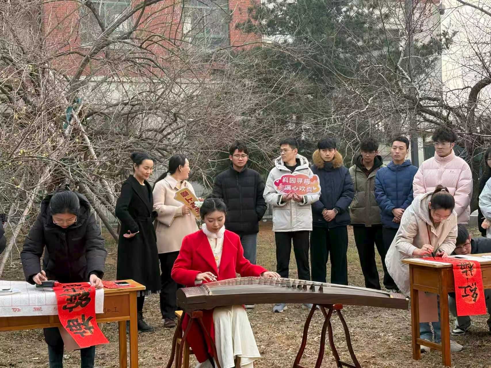 活动现场还融入了多元的艺术展示:古筝演奏者孟一诺指尖流淌出《梅花三弄》的清雅旋律;王甜甜、纪玉涵同学在案前挥毫泼墨,书写咏梅对联,琴音与墨香相映成趣;易凡即兴献唱《红梅赞》,为活动增添了浓厚氛围。随后,心健联副会长张益豪从心理学角度阐释如何从腊梅“耐寒”与“不争”的特质中汲取力量,锤炼应对学业压力与人生挫折的心理韧性,同学们定格下与腊梅、师友的美好瞬间。