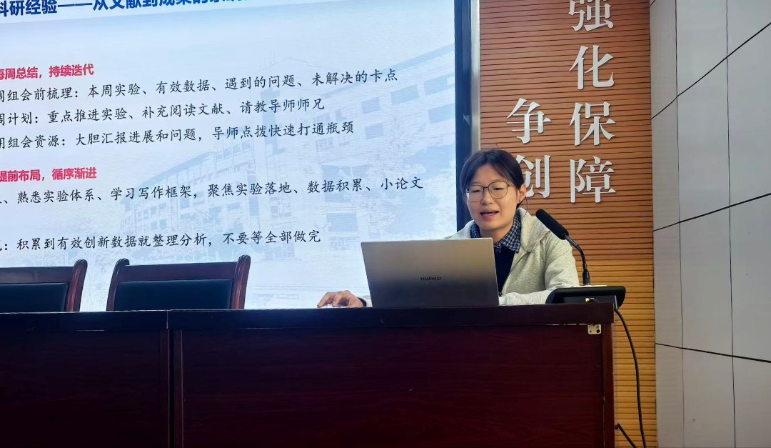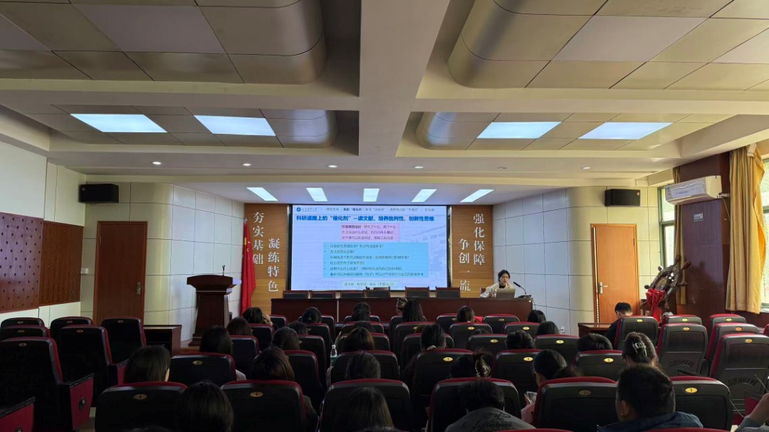 “催化剂”研究生讲坛第一期在J2-104报告厅举行。本期讲坛特邀孙梦雪、杨胜霞两位国家奖学金获得者作专题分享,2025级学硕班全体研究生到场聆听。分享中,孙梦雪以“筑牢学术根基、平衡科研成长、打通国际视野、青春接续奋斗”为主线,系统讲解了从文献阅读、实验操作到成果产出的全流程经验;杨胜霞则聚焦电催化制氢前沿,结合“双碳”背景解析课题设计,分享了论文投稿与专利申报的实战技巧,鼓励大家以热爱为动力,在科研中勇于试错。