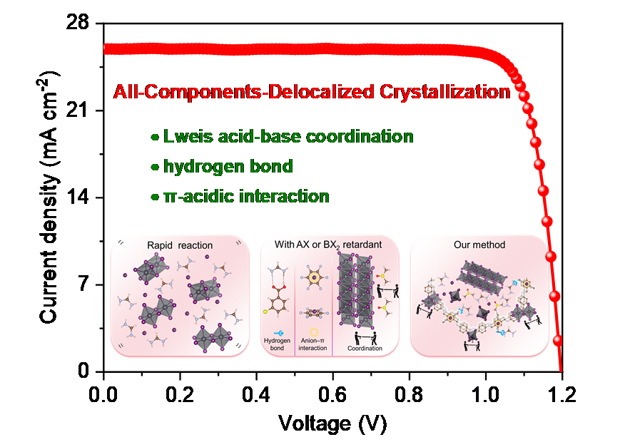 钙钛矿太阳能电池因其出色的光电转换效率而被视为下一代最有应用潜力的光伏技术之一。传统钙钛矿薄膜在制备过程中结晶反应速度过快,往往容易生成不利于器件性能的中间相与各类缺陷。为突破这一瓶颈,团队聚焦于具有可定制化特性的共价有机框架材料,通过对COF非骨架基团(如-F-H-OCH等)进行精准设计,实现了COF与钙钛矿组分之间的多重作用。理论与实验结果表明,相较于其它给电子基团,引入含强吸电子氟原子能够诱导产生局部不对称的电子分布,从而在COF骨架上同步构建三个功能中心:受体单元上的负电性路易斯碱中心、给体单元上的正电性π酸性中心,以及侧链上的氢键中心。这三个功能位点可分别与钙钛矿中的铅离子、游离碘离子及甲脒有机阳离子发生离散式相互作用。借助这种多位点协同作用,研究实现了微观尺度内对钙钛矿组分扩散与结晶行为的精细调控,进而有效钝化缺陷。得益于薄膜质量的显著提升与缺陷的有效抑制,所制备的反式钙钛矿太阳能电池获得了高达26.02%的光电转换效率,并在严苛测试条件下展现出优异的稳定性。该工作为通过分子工程策略调控钙钛矿结晶与缺陷钝化提供了新思路。